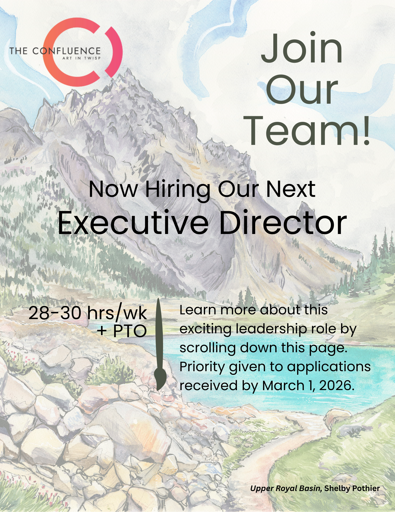 Confluence Gallery and Art Center dba as The Confluence: Art in Twisp (“the Confluence Gallery”; the “Gallery”) announces its search for an Executive Director. The Confluence Gallery is a non-profit 501(c)(3) visual and literary arts gallery located in Twisp, Washington. The Gallery opened in 1988 and features a main gallery, a community gallery, a gallery shop, as well as displays of works by local writers who regularly present their work in the Gallery.